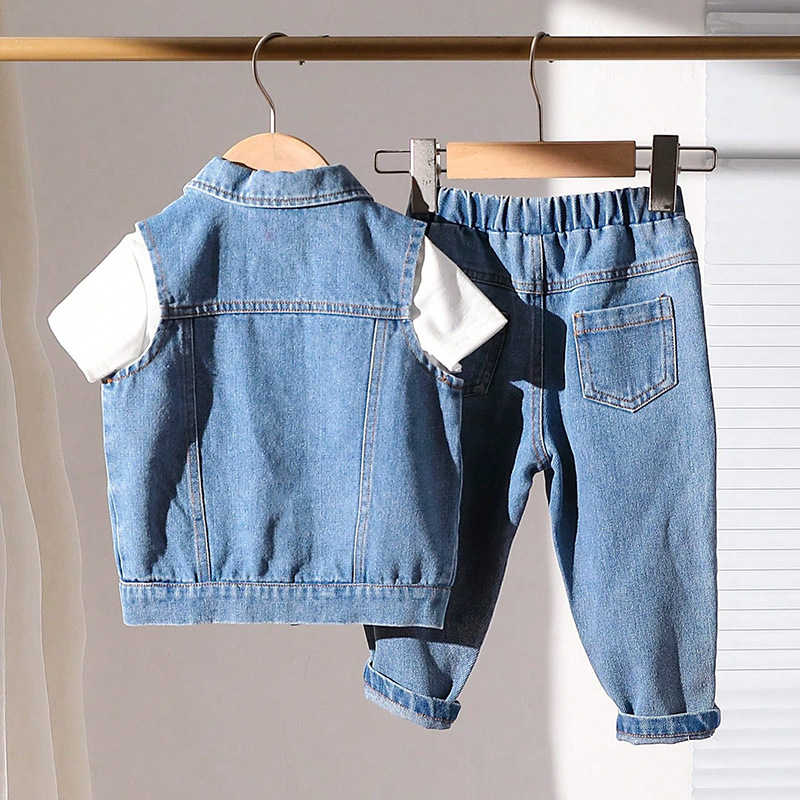 Baby And Toddlers Unisex Denim Jacket, White Inner Tee With Patched Trouser 3pcs