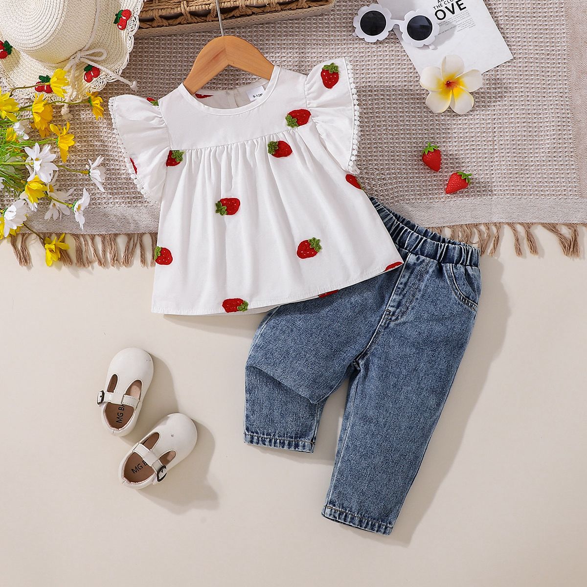 Baby Girl And Toddler Girl Strawberry Top With Denim Trouser 2pcs