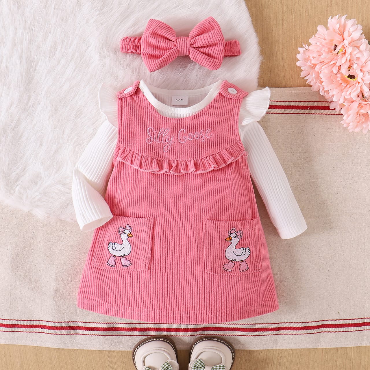 Be the first to review “Baby And Toddler Girl Duck Peach Dung with white Long-sleeved Top And Hairband” Cancel reply