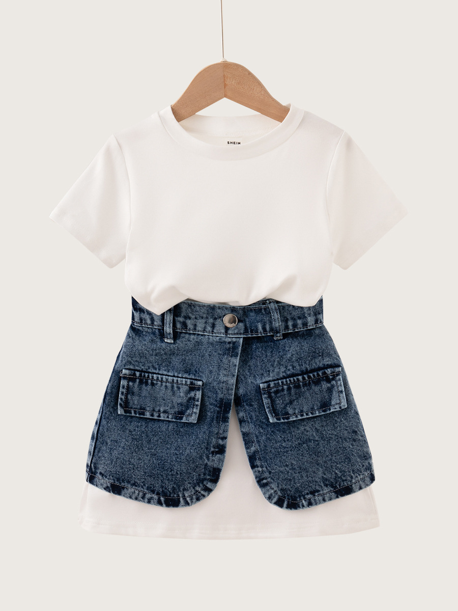 Girls White T-Shirt Dress With Denim Overlay Skirt 2pcs