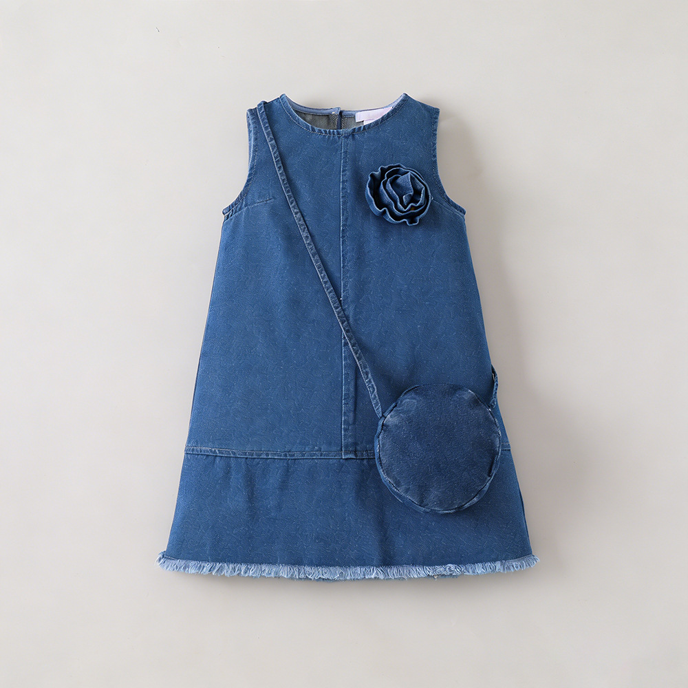 Kids Girls Sleeveless Denim Dress with Flower Detail and Matching Purse – Casual Wear