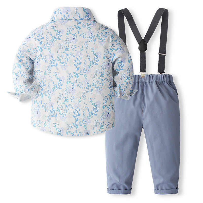 Toddler Boys Blue Floral Shirt, Sky blue Trouser With Bow Tie & Suspender