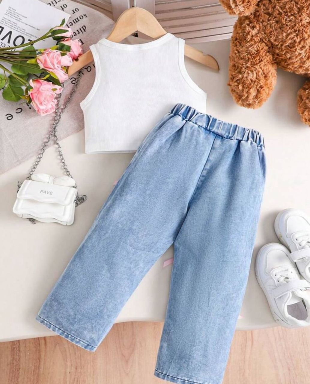 Be the first to review “Toddler Girl Sleeveless Angel White Top With Denim Bow Trouser 2pcs” Cancel reply