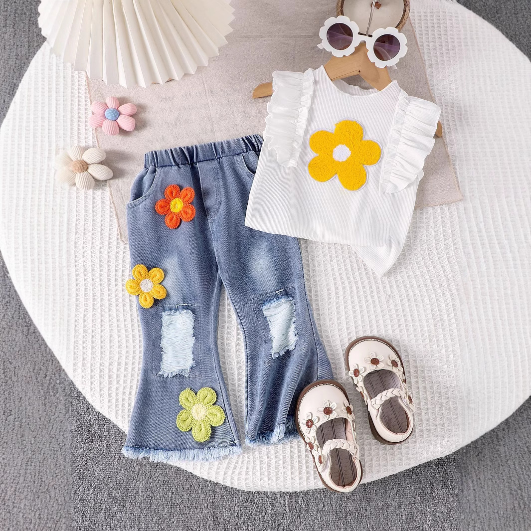Toddler Girl Yellow Floral Top With Patched Denim Trouser 2pcs
