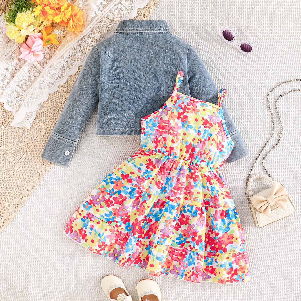 Toddler Girls’ Floral Dress with Cropped Denim Jacket 2pcs